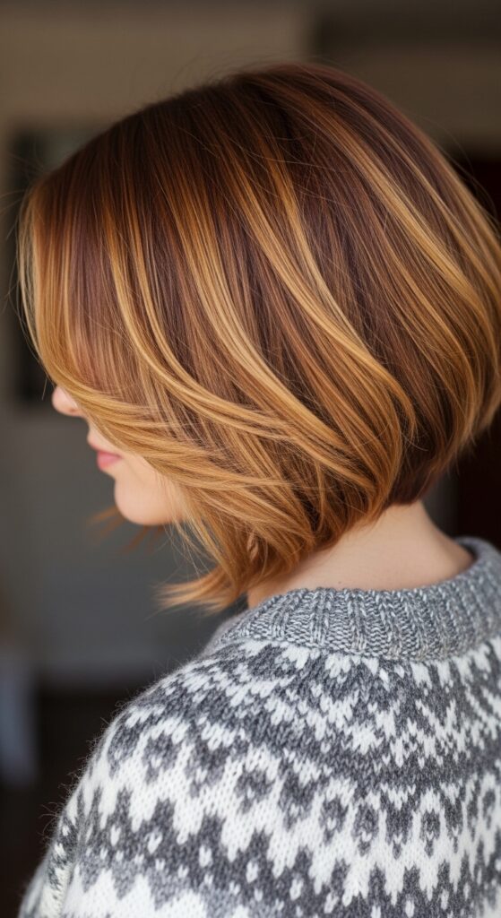 This hairstyle showcases a rich auburn base beautifully enhanced with soft golden-blonde highlights that frame the face and flow seamlessly through the lengths. The warm red undertones create depth, while the lighter highlights add brightness and a sun-kissed glow. The smooth, glossy finish emphasizes the multidimensional color, making the hair look healthy, elegant, and naturally radiant. This auburn hair color with highlights is ideal for anyone seeking a refined yet fresh look that balances warmth with subtle contrast.