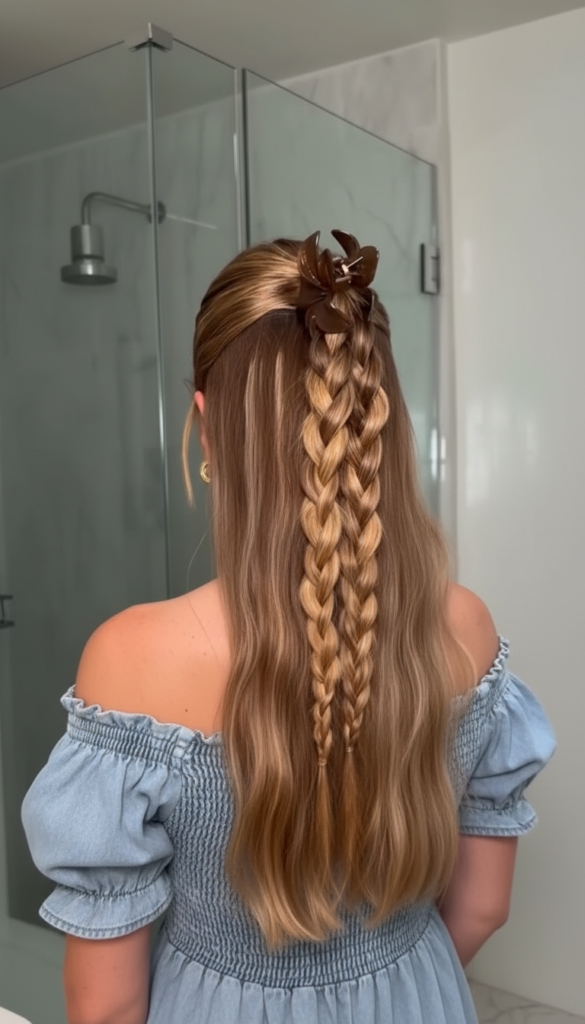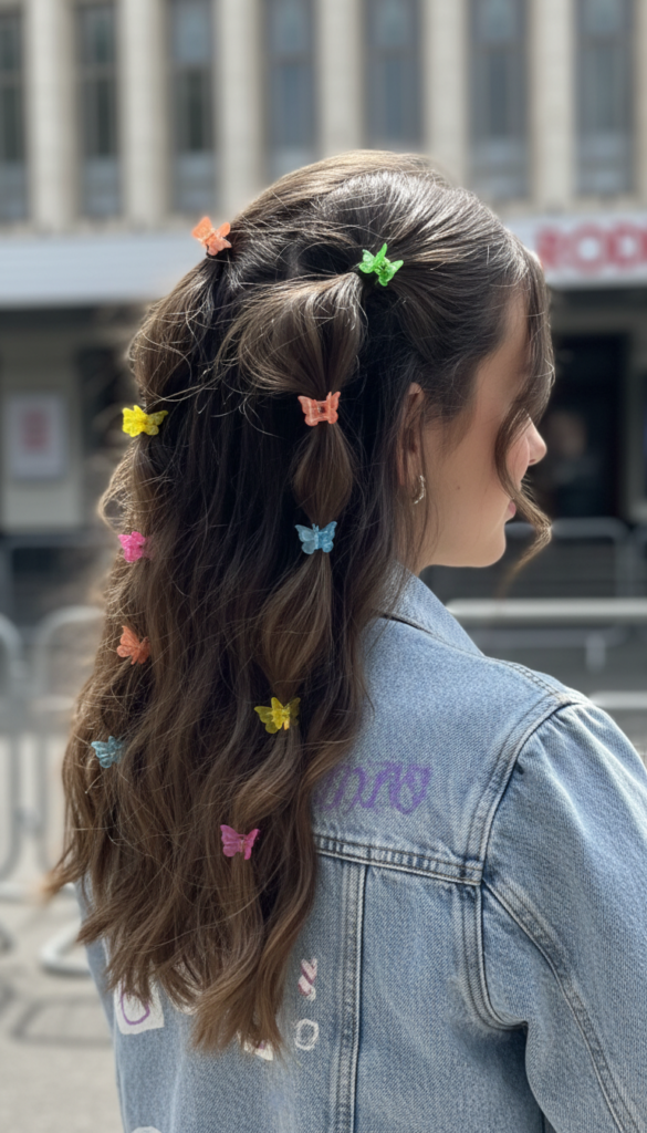 Simply part your hair as desired, twist or braid small front sections, and secure them with colorful or neutral butterfly clips for a coordinated look. The result is light, airy, and full of personality, proving that hair accessories can instantly elevate even the simplest hairstyle.