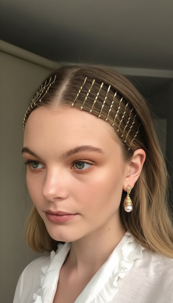The crown of pins hairstyle is a minimalist yet striking look that uses decorative bobby pins arranged along the side or around the head like a subtle halo. Instead of hiding pins, this style celebrates them as statement accessories, whether in metallic tones, pearls, or geometric designs.