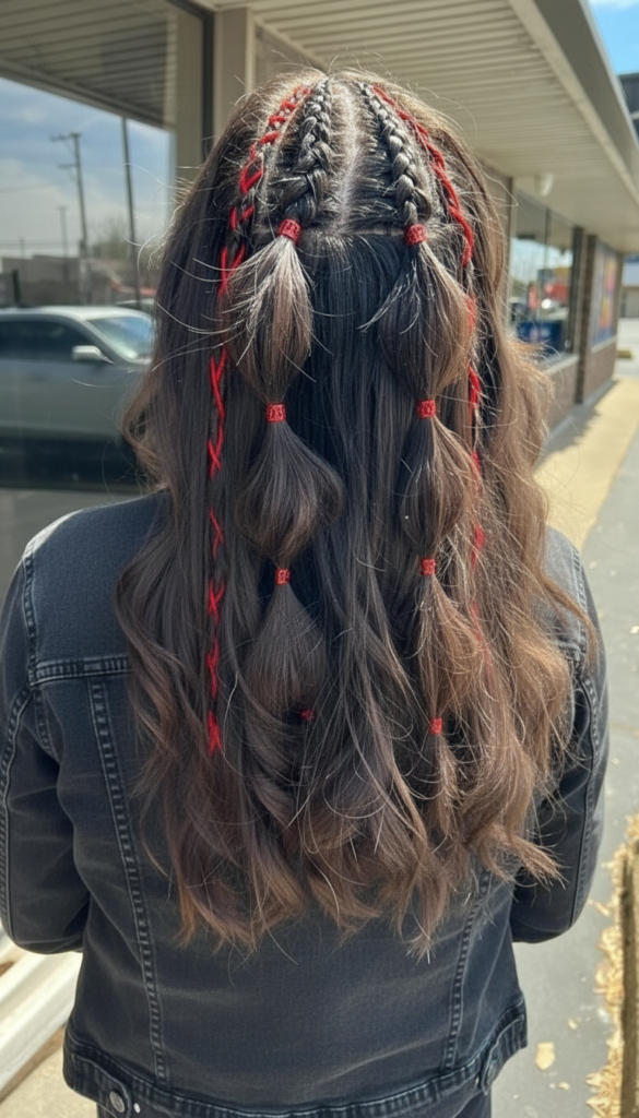 Ribbon braids add a soft, romantic twist to traditional braiding by weaving a ribbon directly into the strands, creating a beautifully coordinated and eye-catching finish. The ribbon can match your outfit for a cohesive look or contrast for a bold statement.