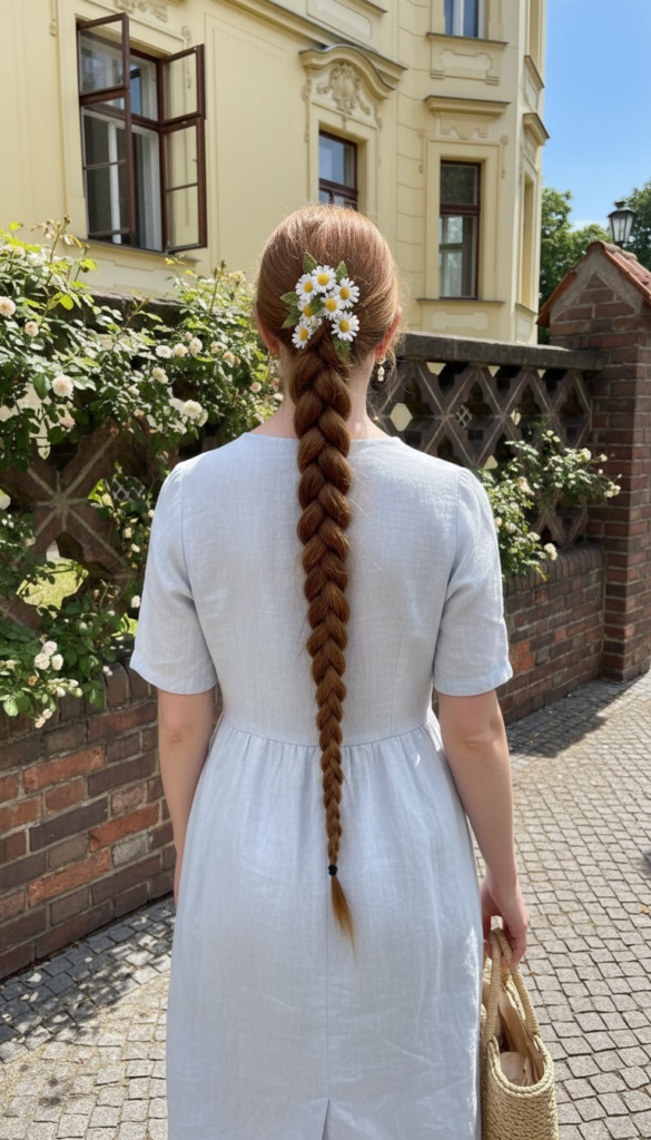 This hairstyle works well with single back braids, pigtail braids, or even crown braids, instantly elevating simple plaits into something more special. Lightweight satin or chiffon ribbons are ideal for summer because they add flair without heaviness. Ribbon braids are perfect for garden parties, picnics, or casual summer weddings where a delicate, feminine touch is desired.