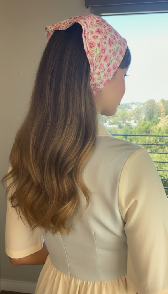 It pairs beautifully with casual outfits, beachwear, or even semi-formal dresses, depending on the scarf’s print and texture. Easy to create yet visually impactful, the scarf-wrapped ponytail is a go-to hairstyle for stylish comfort in warm weather.