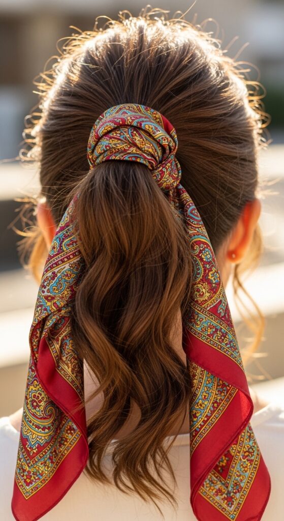 After tying your hair into a high or low ponytail, wrap a lightweight silk or cotton scarf around the base and let the ends flow freely for movement and color. This style adds personality, protects hair from harsh sun exposure, and conceals simple elastics for a more refined finish.