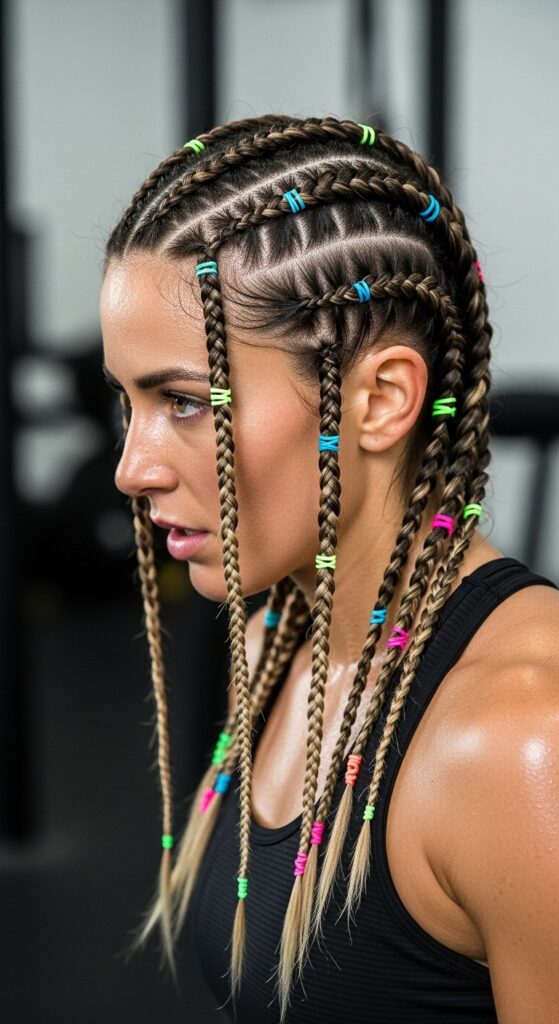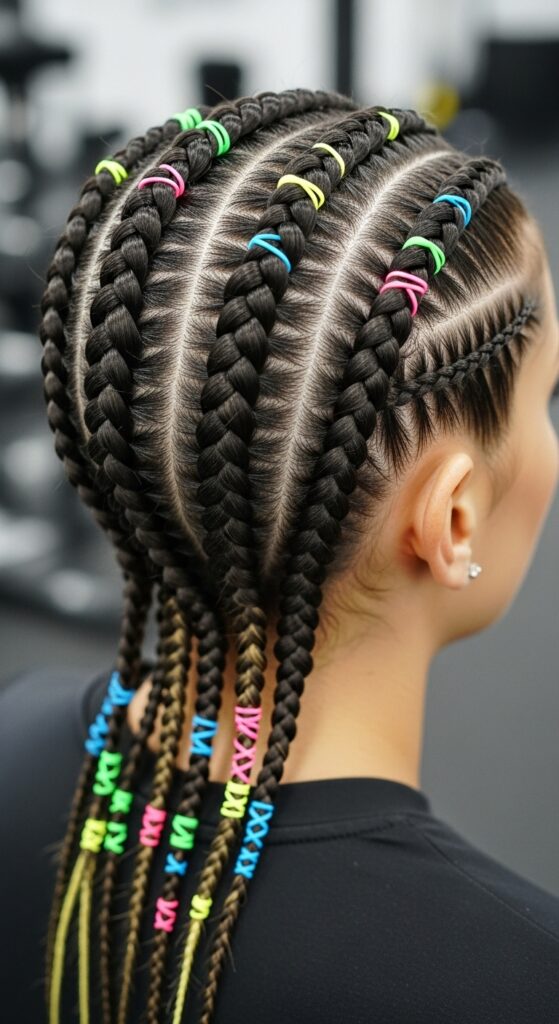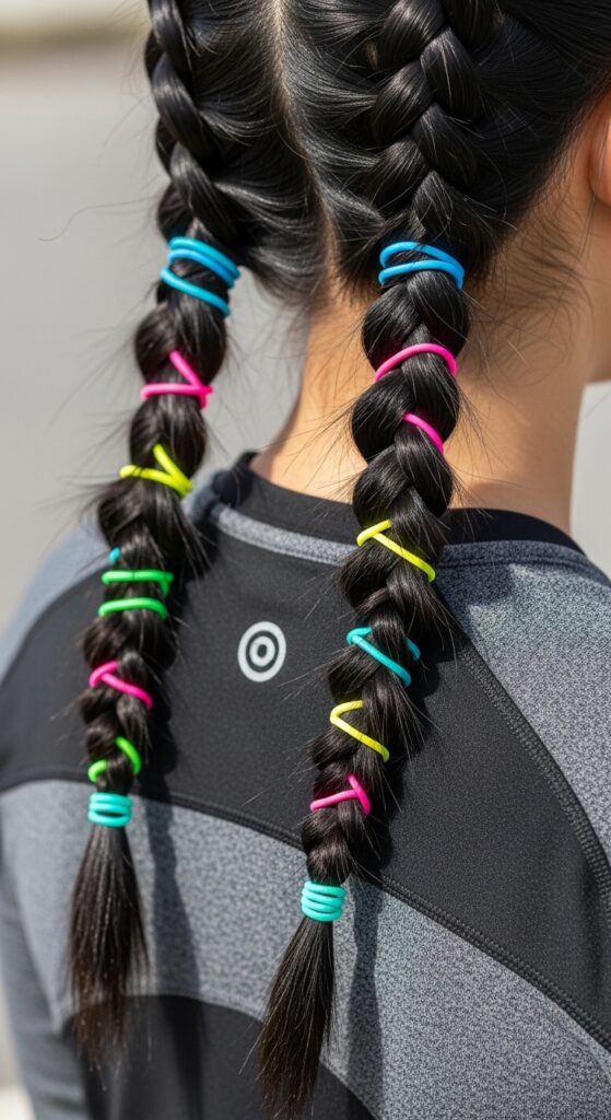 Bright, bold, and beautifully braided—this hairstyle brings a splash of personality to any workout routine. Two symmetrical pigtail braids are tightly woven for maximum hold, each accented with a series of colorful hair ties that add vibrancy and charm. The rainbow of blue, pink, yellow, and green pops against the sleek black and gray athletic wear, turning a practical style into a statement. Perfect for sports, dance, or outdoor training, this look balances youthful energy with functional design, keeping hair secure while celebrating self-expression.