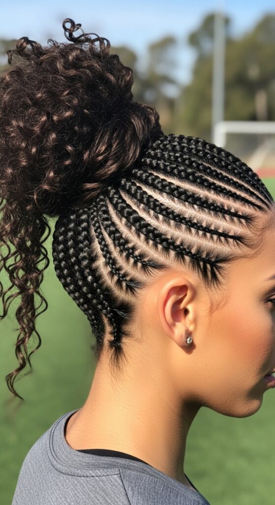 Graceful yet grounded, this curved cornrow bun is a masterclass in balance and boldness. The braids arc symmetrically toward the crown, creating a sculptural frame that draws the eye upward. At the center, a voluminous curly bun bursts with texture, offering a striking contrast to the sleek, tight cornrows below. The defined curls add softness and movement, while the overall structure keeps the style secure—perfect for active days or outdoor sports. Paired with subtle hoop earrings and a neutral top, this look blends athletic edge with refined artistry, making it a standout choice for both performance and presence.