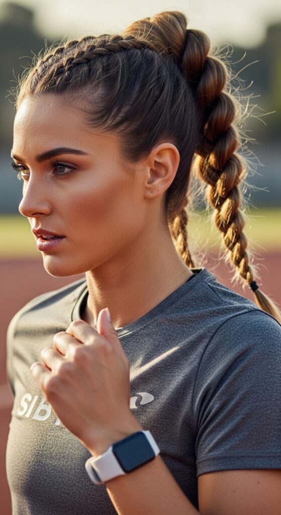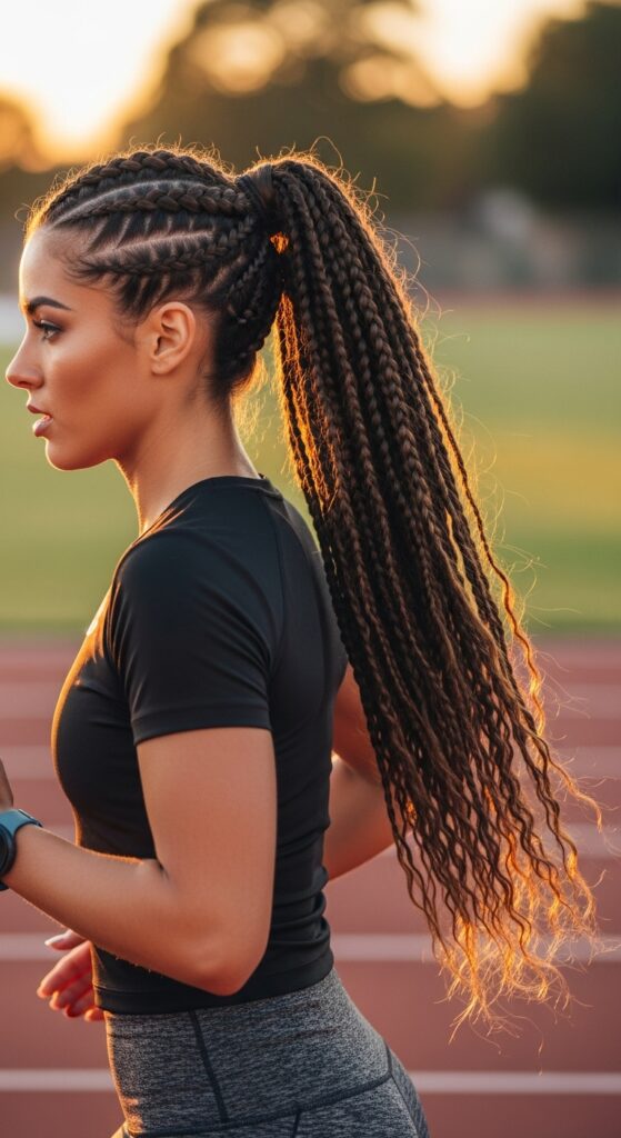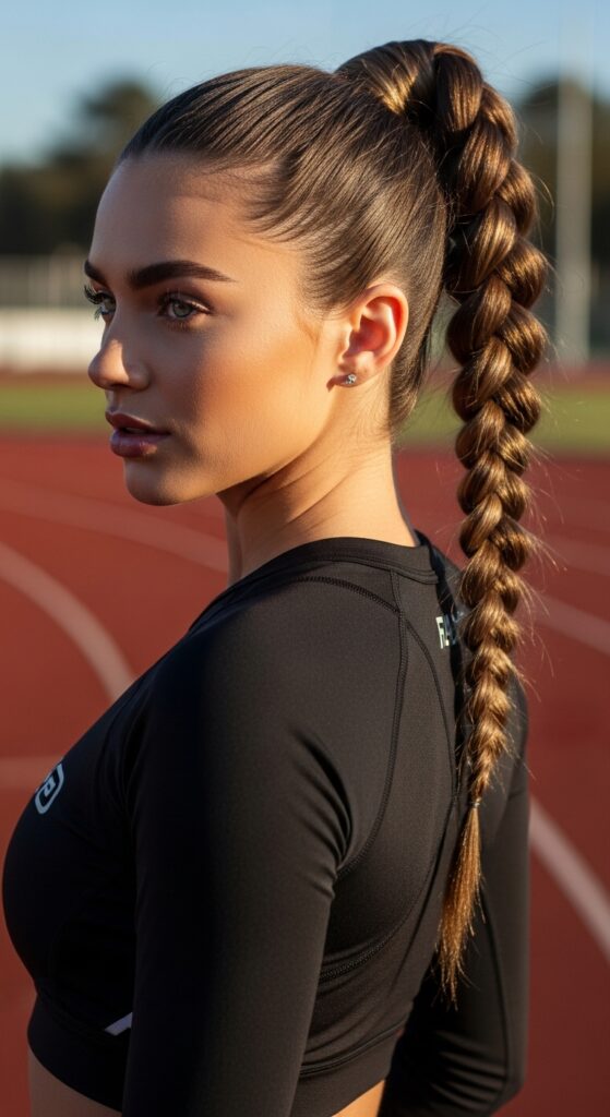 Power meets polish in this streamlined sports hairstyle, designed to keep you focused and fierce. The long, tightly braided ponytail offers maximum control and zero distractions, making it ideal for high-intensity workouts or track sessions. Its sleek finish pairs perfectly with a fitted black athletic top, creating a bold silhouette that radiates strength and confidence. Captured during golden hour, the warm lighting enhances the braid’s texture and the overall mood of determination. Whether you’re sprinting toward a goal or simply embracing your inner athlete, this look is all about precision, performance, and unapologetic style.