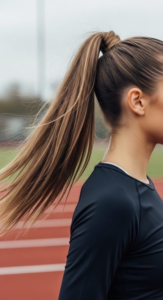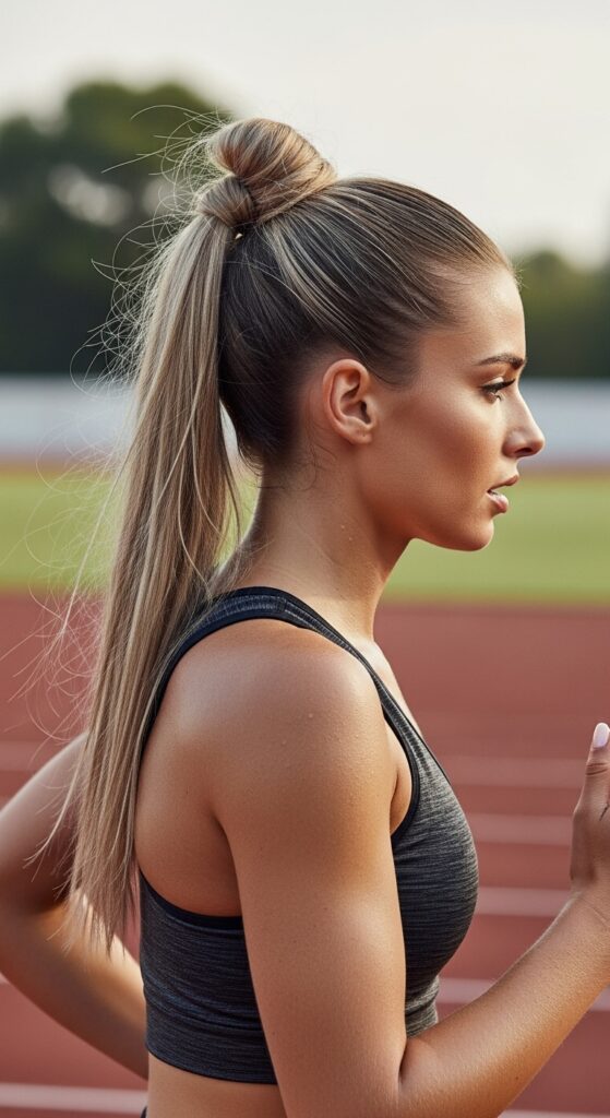Momentum meets minimalism in this sleek high ponytail—an ideal choice for runners who crave both style and performance. The long, straight strands are pulled into a tight, elevated ponytail that stays secure through every stride, while the clean silhouette complements the athletic aesthetic. Captured mid-motion on a sunlit track, this look radiates energy and focus. Paired with a dark sports bra and the warm tones of an outdoor setting, the hairstyle becomes a statement of discipline and drive. It’s the perfect fusion of simplicity and power, built for those who run with purpose.