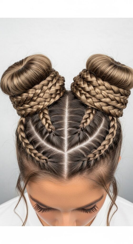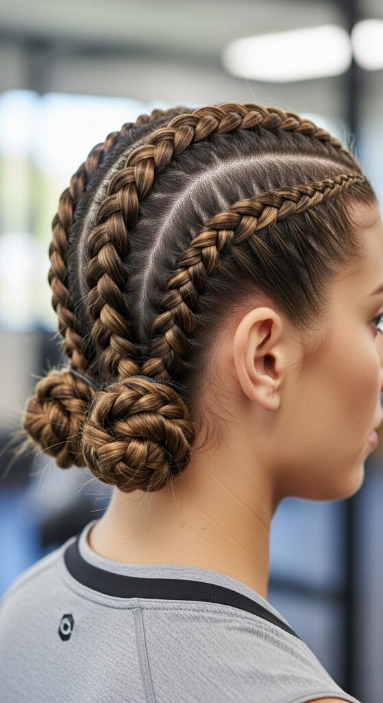 Elevate your sporty style with this breathtaking braided crown bun look—a true showcase of symmetry, skill, and creative flair. The center part anchors the design, while multiple tight braids radiate outward like sunbeams, weaving around two perfectly wrapped buns perched on either side of the head. Each bun is encircled by braided sections, creating a layered, sculptural effect that’s both bold and refined. The glossy finish adds polish, while the intricate patterning turns this hairstyle into wearable art. Ideal for dance, fitness, or fashion-forward sports shoots, this look blends athletic edge with high-concept beauty.