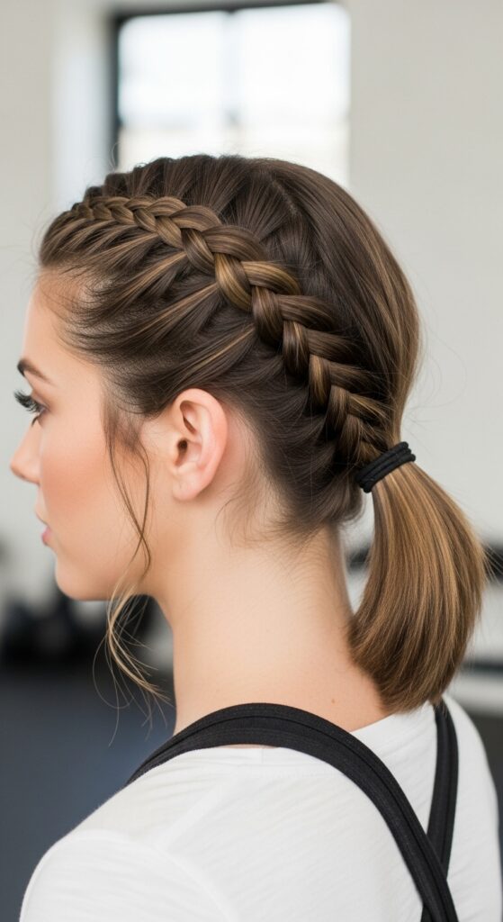 Timeless and totally gym-proof, the French braid shown here is a staple for anyone who wants their hair to stay put while they power through reps. Starting at the crown and woven tightly down the back, this braid offers a clean silhouette and even tension—ideal for high-movement workouts and long training sessions. The sleek finish keeps flyaways in check, while the single tail adds a touch of casual charm. Paired with a sleeveless athletic top and a fitness-focused setting, this look is all about discipline, ease, and understated style.