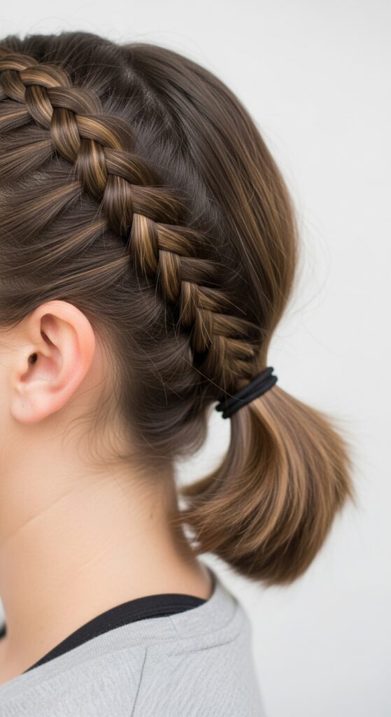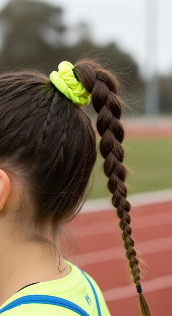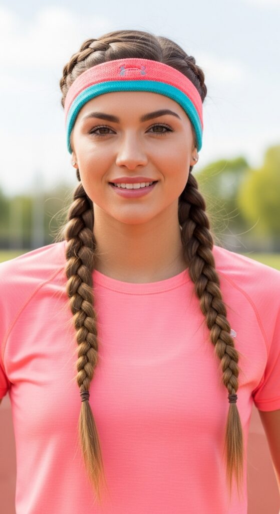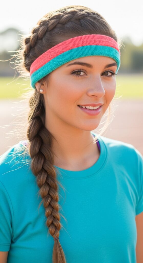 Bright, breezy, and ready to move—this over-the-shoulder braid paired with a striped headband is a winning combo for outdoor sports and active routines. The thick braid keeps hair secure and tangle-free, while the turquoise and coral pink headband adds a pop of color and keeps sweat at bay. Framed by natural sunlight and a sporty turquoise top, the look radiates energy and freshness. It’s a style that’s as practical as it is expressive—perfect for track practice, field games, or any moment where movement meets personality.