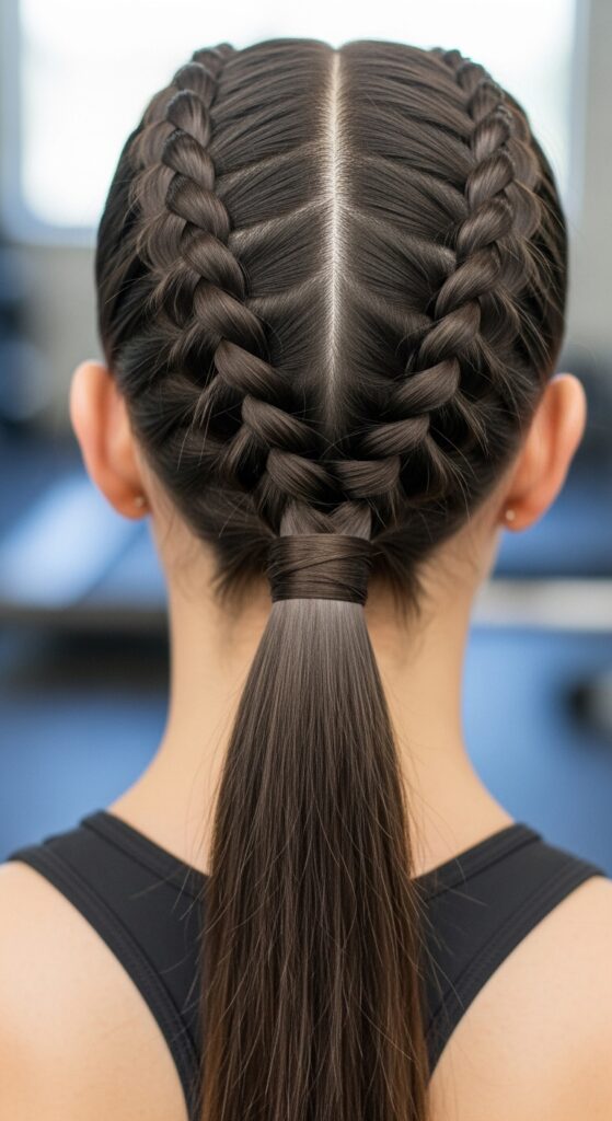 Symmetry meets strength in this polished hairstyle designed for movement and control. Two French braids begin at the crown, hugging each side of the head with clean, even tension before merging into a sleek ponytail at the nape. This fusion of braiding and ponytail offers the best of both worlds—secure hold for high-impact workouts and a streamlined finish that transitions effortlessly from gym to street. The middle part adds structure, while the gathered tail keeps things fuss-free and functional. It’s a go-to style for athletes who value precision, comfort, and a touch of elegance in their routine.