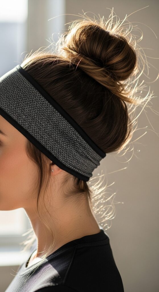 Low-maintenance meets high-performance in this laid-back yet functional sports hairstyle. The hair is swept into a casual messy bun, allowing for quick styling and maximum airflow—ideal for workouts that demand focus and movement. A textured gray headband anchors the look, keeping flyaways in check while adding a touch of sporty flair. This combo is perfect for athletes who want comfort without compromising style, especially during early morning runs or post-gym errands. The natural lighting and soft strands give it an approachable, real-life vibe that resonates with active lifestyles.