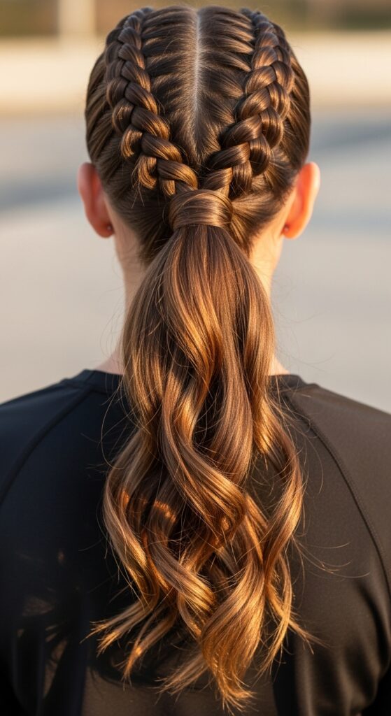 This hairstyle blends athletic precision with romantic flow, making it a standout for both active and casual settings. Two symmetrical Dutch braids begin at the crown, hugging the scalp with clean, defined structure before merging into a single ponytail at the nape. The transition is seamless, with a wrapped section concealing the tie for a polished finish. From there, loose, voluminous curls spill down the back, adding movement and softness to the look. It’s a style that speaks to versatility—perfect for a workout, a day out, or even a low-key event where elegance meets ease.