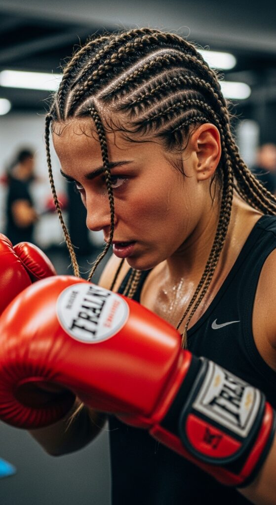 Focused, fierce, and built for battle—this tightly braided ponytail is the ultimate companion for high-intensity boxing sessions. The hair is secured close to the scalp, minimizing movement and keeping the fighter’s vision clear and concentration sharp. Sweat-resistant and distraction-free, this style is all about control and endurance. Paired with bold red gloves and a sleek athletic top, the look channels raw energy and discipline. It’s not just a hairstyle—it’s part of the gear, designed to stay locked in while the punches fly and the adrenaline surges.