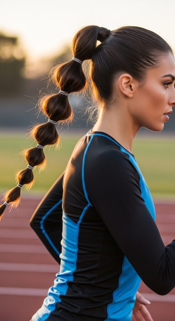 Bold, breathable, and built for speed—the bubble ponytail is a dynamic choice for athletes who want their hair to make a statement while staying out of the way. This style starts with a sleek high ponytail, segmented into evenly spaced “bubbles” using hair ties, creating a rhythmic, sculptural effect that bounces with every stride. It’s not just visually striking; the bubble structure helps distribute weight and tension, reducing scalp strain during long runs or intense workouts. Paired with a streamlined athletic outfit, this look radiates power, motion, and modern edge—perfect for track stars and fitness enthusiasts alike.