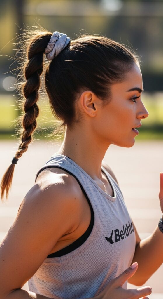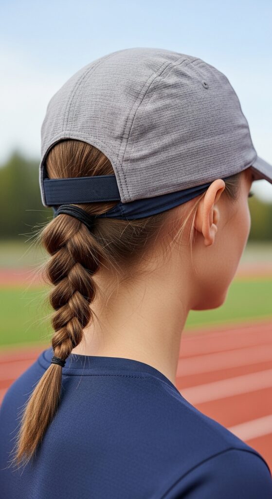 Simple, sleek, and built for performance—this single braid tucked beneath a cap is the ultimate no-fuss hairstyle for runners and outdoor athletes. The hair is neatly pulled back and braided down the center, offering a secure hold that resists frizz and flyaways during long-distance sessions. Paired with a gray cap and navy athletic wear, the look is clean and focused, perfect for early morning runs or track workouts. It’s a style that prioritizes comfort and clarity, letting you concentrate on pace and power without worrying about your hair.