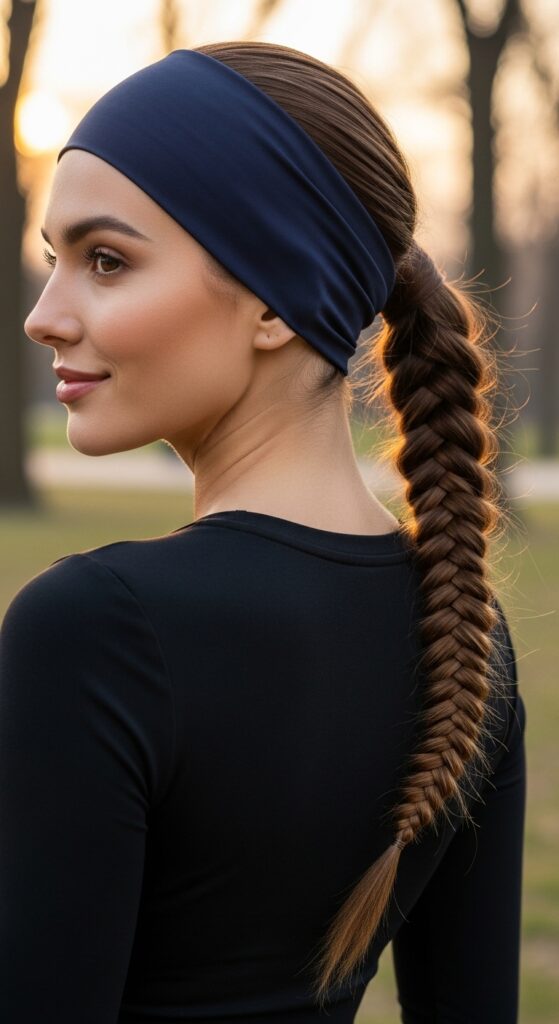 Golden hour meets grounded grace in this long, thick braided ponytail—an ideal style for outdoor workouts or meditative movement. The braid is sleek and secure, flowing down the back with a sense of quiet power, while the navy headband adds both function and contrast. Framed by warm light and natural surroundings, the hairstyle feels intentional yet relaxed, perfectly suited for early morning runs or sunset stretches. It’s a look that speaks to discipline, serenity, and self-care—all woven into every strand.