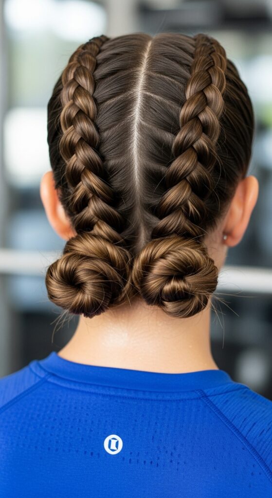 Clean, controlled, and effortlessly cool—this hairstyle is a go-to for athletes who want both form and function. Two Dutch braids begin at the crown, hugging the scalp with precision before coiling into compact buns at the nape. The result? A secure, no-slip style that holds up through high-intensity workouts, long training sessions, or even a full day on the move. The tight weave keeps flyaways in check, while the low bun placement ensures comfort under helmets or caps. It’s a style that says: ready for action, but never compromising on polish.