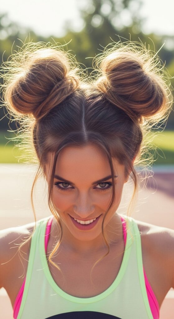 Whether you’re hitting the court or just channeling athletic energy, this double bun hairstyle is a playful yet practical choice for active days. The symmetrical top buns keep hair securely in place, while loose strands around the face soften the look with a touch of effortless charm.
