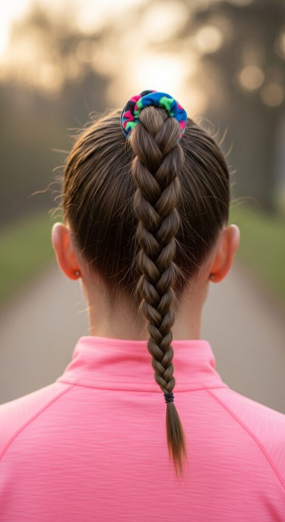 Neat, minimal, and quietly expressive—this single braid style is a perfect blend of simplicity and charm for active outdoor routines. The hair is smoothly pulled back into a clean braid, secured with a playful scrunchie that adds a pop of color and personality. The mix of blue, green, and pink in the accessory contrasts beautifully with the soft pink athletic jacket, creating a look that’s both coordinated and carefree. Ideal for morning jogs, nature walks, or light training sessions, this hairstyle keeps things tidy while embracing a relaxed, feminine vibe. The serene backdrop only enhances its appeal, making it a go-to for those who value both function and aesthetic.