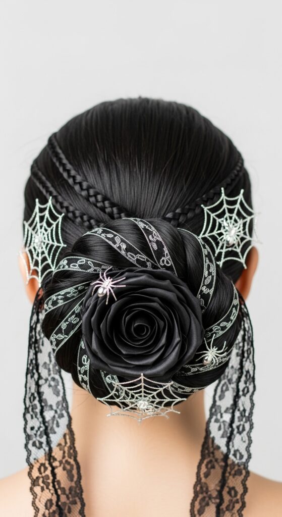 Elegance meets eerie in this sculptural Halloween hairstyle, where strands are masterfully shaped into a voluminous bun that mimics the delicate layers of a black rose. Glossy and precise, the bun anchors the look with dramatic flair, while surrounding braids and lace ribbons weave in gothic romance. Spiderweb-shaped accessories glint from strategic placements, adding a hauntingly beautiful touch that feels both regal and mysterious. Ideal for fashion-forward costume events or editorial shoots, this style is a celebration of craftsmanship and seasonal storytelling—where every twist and ornament whispers Halloween enchantment.