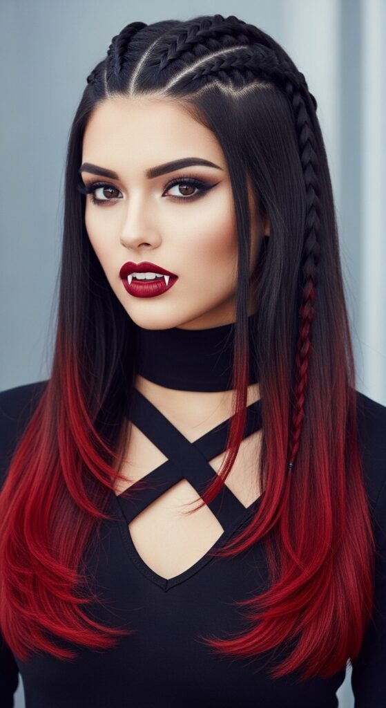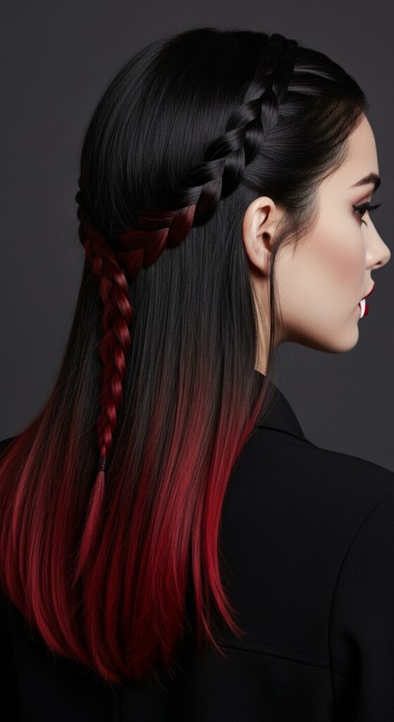 A fiery gradient meets intricate styling in this Halloween-ready braid that commands attention. Starting with deep black roots that melt into vibrant crimson tips, the color transition evokes flickering candlelight and autumn shadows. The braid itself is a masterclass in control and elegance—beginning at the crown and wrapping smoothly around the head before cascading down the back in a single, polished plait. The sleek finish and bold contrast make this look ideal for costume parties, editorial shoots, or blog features that celebrate seasonal drama with a refined edge.