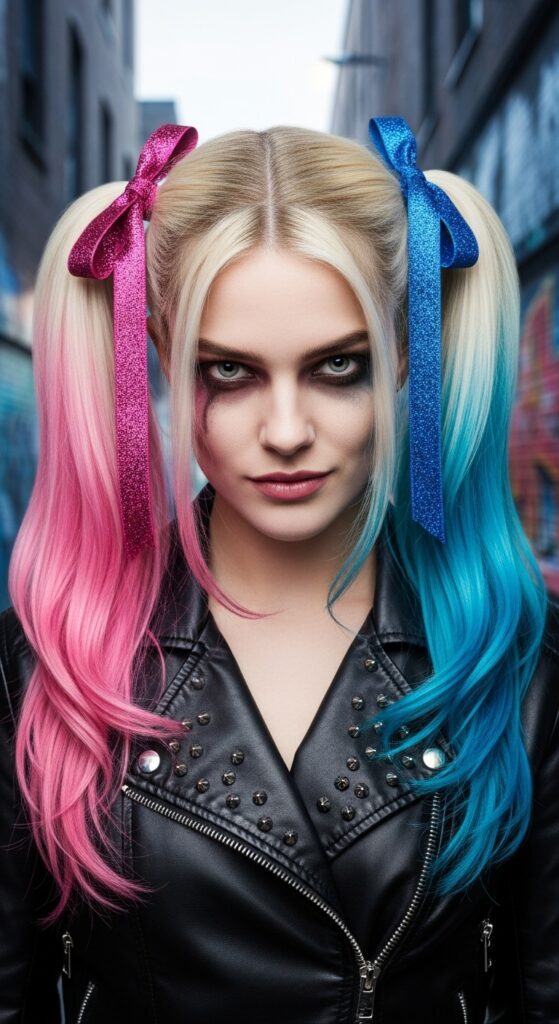 Channeling pure Halloween attitude, this hairstyle takes inspiration from pop culture’s most iconic mischief-maker. Platinum blonde hair is styled into two high ponytails, each dyed in bold split tones—cotton candy pink on one side, electric blue on the other. Glittery ribbons match the hues, adding sparkle and cohesion to the rebellious look. Paired with smudged eyeliner, dark eyeshadow, and a studded leather jacket, the style radiates gritty glam against a graffiti-lined alley backdrop. It’s a fearless fusion of costume and street style, perfect for Halloween nights that demand drama and unapologetic flair.