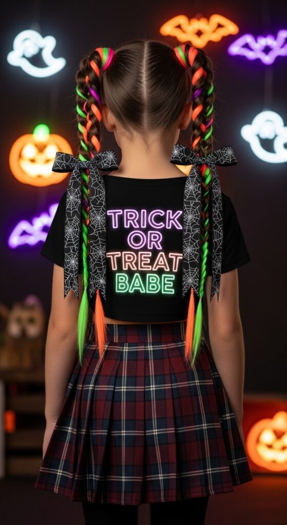 Halloween goes high-voltage in this electrifying look that blends bold color with playful attitude. Braided strands in neon green, orange, and pink pulse with energy, tied off with black ribbons printed in white spiderwebs for a spooky-chic finish. The black tee—emblazoned with “TRICK OR TREAT BABE” in glowing neon text—sets the tone for festive mischief, while a dark plaid skirt grounds the look in seasonal edge. Surrounded by glowing jack-o’-lanterns, bats, and ghosts, the entire scene radiates Halloween spirit with a modern twist. Perfect for parties, themed shoots, or content that craves color and character.