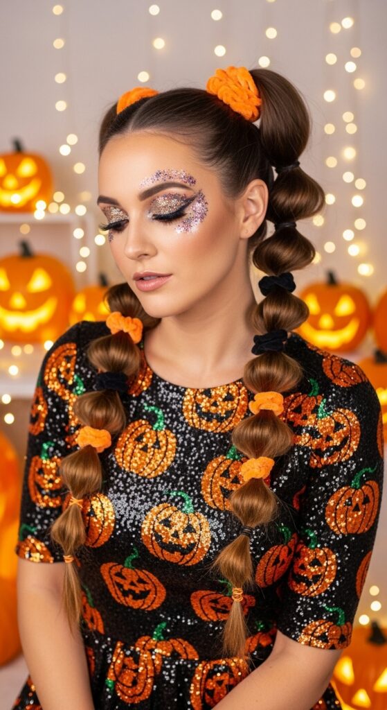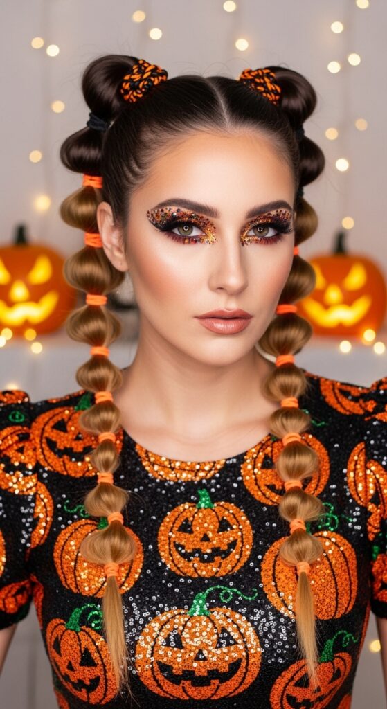 A celebration of playful elegance, this Halloween hairstyle turns heads with its vibrant bubble ponytails and festive flair. Long, curly locks are styled into segmented bubbles, each cinched with alternating orange and black scrunchies that echo the season’s signature palette. The hair gleams with subtle glitter, catching the glow of nearby jack-o’-lanterns and string lights. Paired with a sequin-studded black dress covered in sparkling pumpkins and dramatic purple-silver eye makeup, the look radiates Halloween cheer with a glamorous twist. Perfect for costume parties, themed shoots, or blog features, this style blends whimsy and polish in equal measure.