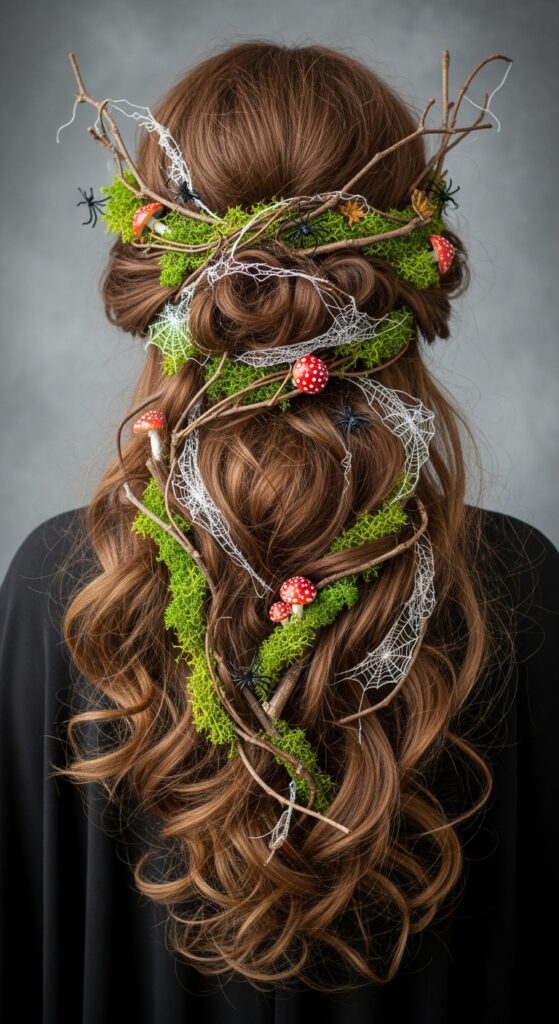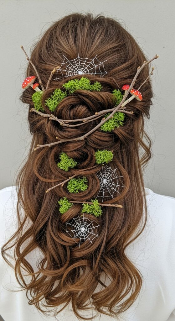 Nature and fantasy entwine in this spellbinding Halloween hairstyle, where earthy textures meet ethereal charm. Medium-length hair is sculpted into a whimsical updo, woven with delicate white spiderwebs and braided accents that evoke woodland magic. Nestled among the strands are vibrant red mushrooms with snowy spots, sprigs of green moss, and rustic twigs—each element carefully placed to create a living fairytale effect. The result is a hauntingly beautiful fusion of forest folklore and seasonal flair, ideal for costume parties, fantasy shoots, or blog features that celebrate imaginative styling.