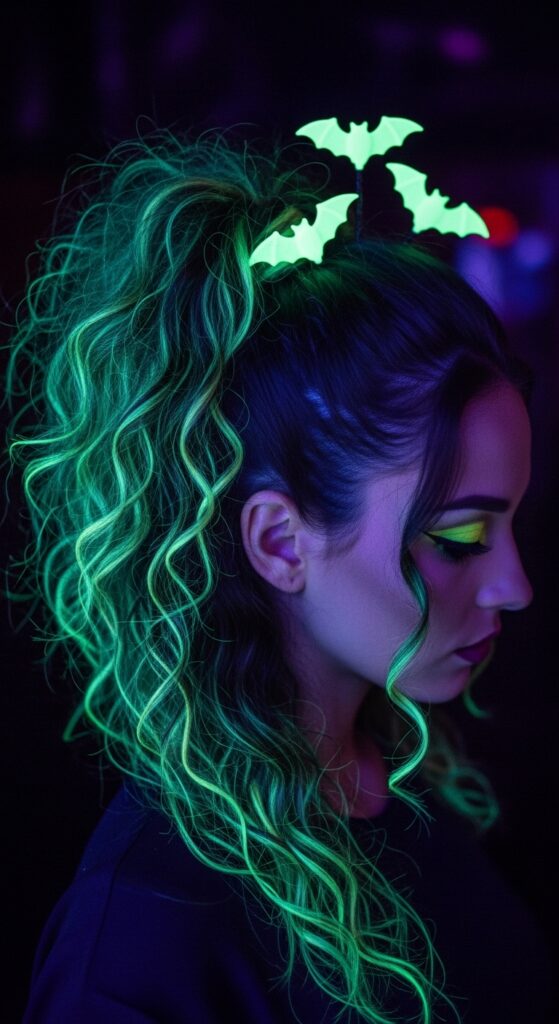 11. Neon Bat Ponytail with Blacklight Glow and Spooky Glam