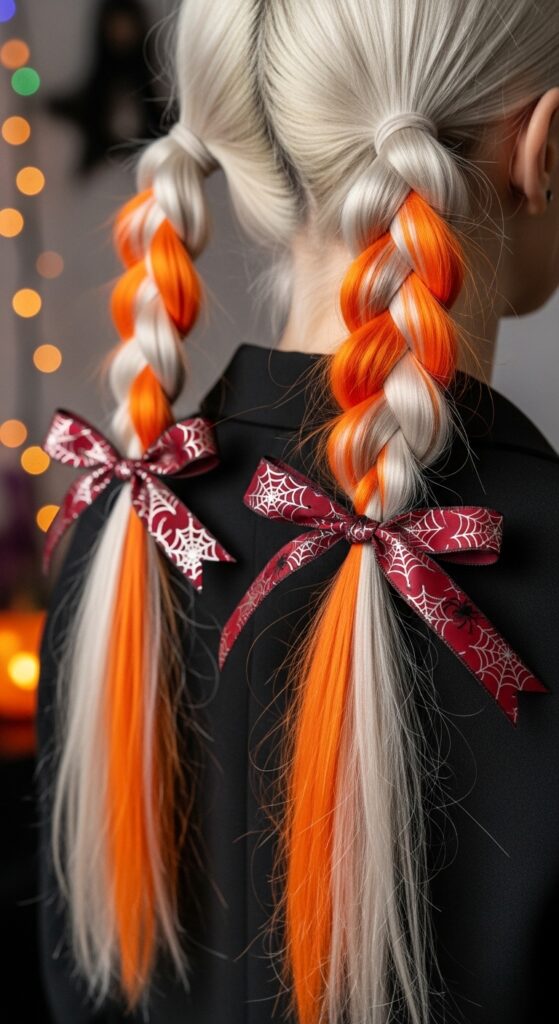 A striking blend of softness and seasonal edge, this Halloween hairstyle features twin braids woven with vivid orange strands that blaze through platinum blonde like flickers of candlelight. Each braid is cinched with crimson ribbons etched in delicate white spiderwebs—adding a playful nod to spooky season without sacrificing elegance. The warm glow of blurred background lights enhances the festive vibe, making this look ideal for autumn gatherings, costume parties, or cozy content shoots. It’s a perfect balance of charm and character, where every detail feels intentional and delightfully eerie.