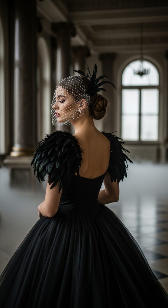 24. Midnight Veil Elegance with Feathered Drama and Gothic Grandeur