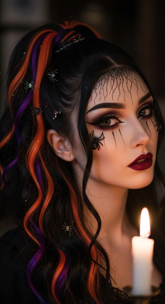 A high ponytail becomes a Halloween masterpiece in this electrifying style, where cascading waves are streaked with vivid orange and violet—evoking twilight skies and flickering candlelight. Spider accents creep through the strands, while a web-patterned bow anchors the look with theatrical charm. The makeup intensifies the drama: smoky eyes framed by hand-drawn webs, deep lipstick, and strategically placed spiders that blur the line between beauty and costume. Lit by candlelight, the entire aesthetic channels gothic romance with a spooky twist—perfect for Halloween parties, editorial shoots, or content that craves bold visual storytelling.
