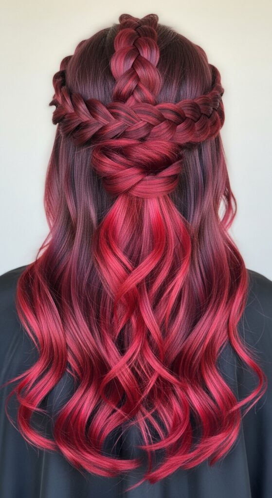 Braids become a royal statement in this Halloween hairstyle, where deep magenta and crimson tones melt into a cascade of soft curls. The crown-like braid formation across the top and middle sections adds symmetry and structure, while the darker roots ground the vivid red ends in moody elegance. Flowing below the intricate plaits, loose waves soften the look with romantic movement, creating a balance between bold color and graceful styling. Perfect for fantasy-themed events, costume galas, or editorial shoots, this look channels power and enchantment in every strand.