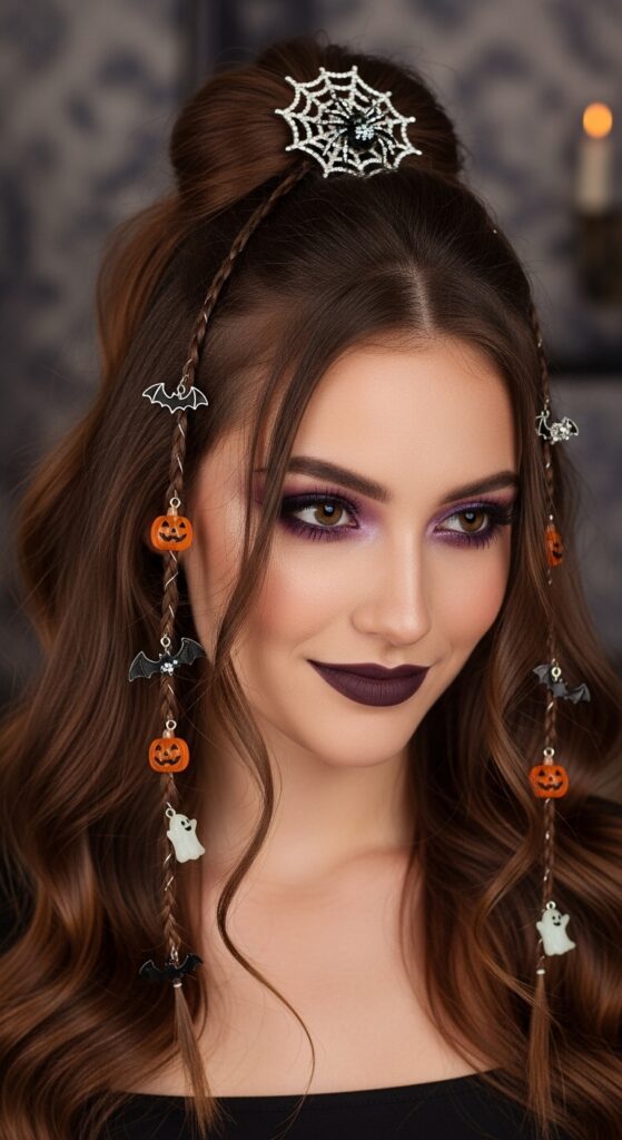 Elevating the half-updo to festive artistry, this Halloween hairstyle weaves together texture, sparkle, and spooky charm. Three central braids anchor the look, each meticulously adorned with themed accessories—glittery black bats, miniature pumpkins, dangling silver spiderwebs, and playful ghosts with orange accents. The braids cascade into loose waves, creating movement and contrast against the structured top. It’s a style that balances eerie elegance with whimsical detail, perfect for costume parties, haunted house events, or Halloween-themed content shoots. Every ornament tells a story, making this look a wearable celebration of the season’s spirit.