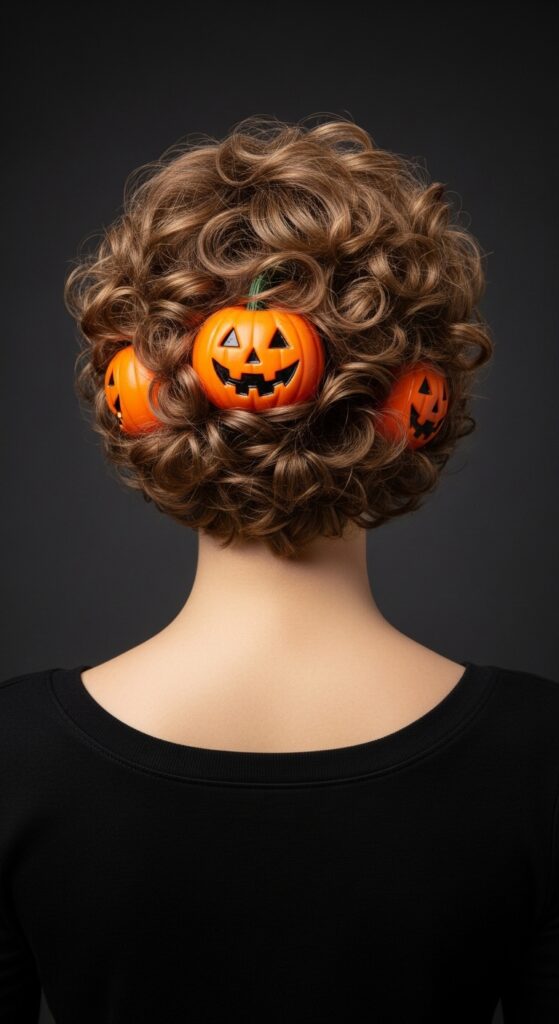 Short curls get a festive upgrade in this playful Halloween hairstyle, where vibrant jack-o’-lanterns peek out from every twist and turn. The rich brown texture provides the perfect backdrop for the bright orange pumpkins, each with classic carved expressions that add a dose of spooky charm. Evenly spaced throughout the curls, these decorations create a whimsical yet balanced look that’s ideal for costume parties, school events, or themed content shoots. It’s a celebration of Halloween spirit in a style that’s bold, joyful, and effortlessly eye-catching.