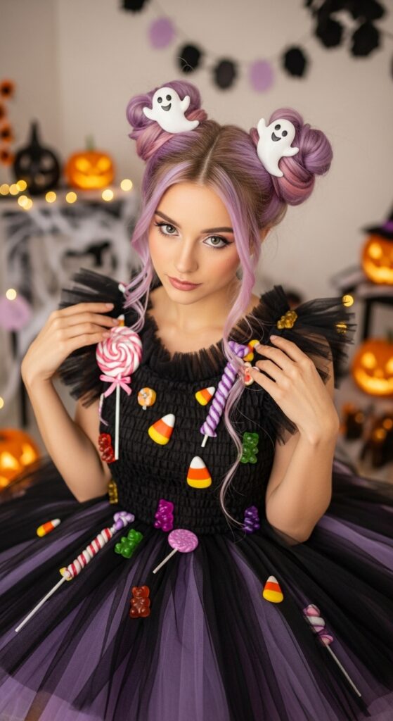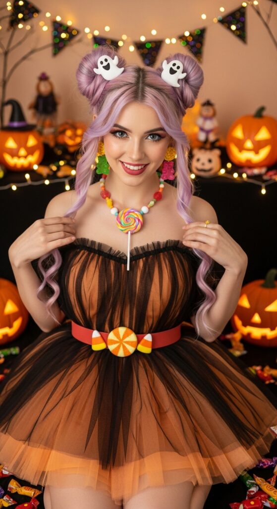 This Halloween look is pure sugar and spirit. Pastel purple hair is styled into twin buns, each crowned with ghost-shaped clips that add a playful supernatural twist. The black-and-orange tulle dress bursts with candy-themed flair—a belt of striped sweets, a lollipop pendant necklace, and glittery beads that echo the festive vibe. Surrounded by glowing jack-o’-lanterns, bunting, and scattered treats, the scene feels like a haunted candy shop come to life. Perfect for costume parties, themed shoots, or blog features, this style blends whimsy, color, and Halloween magic in one unforgettable ensemble.