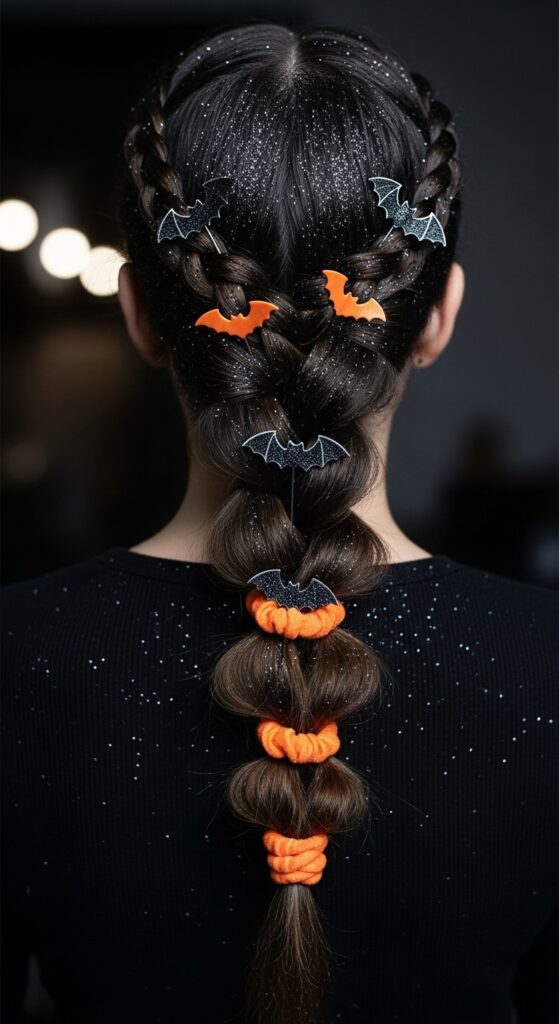 A festive fusion of structure and shimmer, this Halloween hairstyle transforms classic braiding into a playful seasonal statement. Two sleek French braids crown the top, merging into a glossy bubble braid that cascades down the back with polished precision. Glitter threads catch the light, adding a subtle twinkle that complements the dark, glossy base. Halloween-themed accessories—black and orange bat clips and bright scrunchies—are spaced evenly along the braid, creating rhythm and visual intrigue. Ideal for costume parties, school events, or themed content shoots, this look balances bold styling with spooky charm.