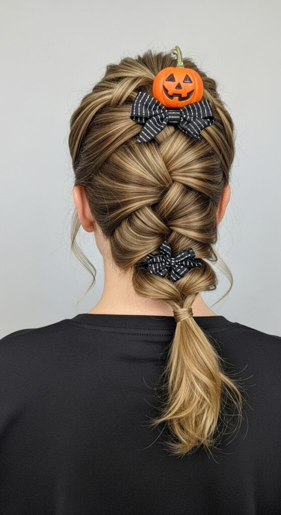 A classic French braid gets a Halloween twist in this polished yet playful hairstyle. Light brown strands are woven into a sleek braid that transitions into a ponytail, punctuated by two black-and-white striped ribbon bows that add graphic contrast and festive flair. Nestled at the crown, a cheerful jack-o’-lantern charm sets the tone—bringing a pop of orange and a dose of spooky spirit. The clean styling and balanced accessory placement make this look ideal for school events, costume parties, or seasonal blog features. It’s a subtle nod to Halloween that’s chic, wearable, and full of character.