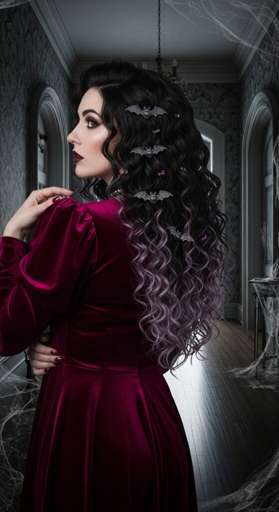 Glowing with gothic allure, this Halloween hairstyle transforms long, wavy brown locks into a spellbinding half-updo that’s equal parts romantic and eerie. A spiderweb-shaped accessory crowns the top, anchoring the look with a touch of haunted elegance. Braided strands cascade down, each laced with miniature Halloween icons—bats, jack-o’-lanterns, and ghosts—that dance through the hair like enchanted trinkets. The dramatic makeup, with deep plum lips and smoky purple eyeshadow, intensifies the mood, while the candlelit backdrop adds a cinematic finish. Ideal for Halloween nights where fashion meets fantasy, this style is a wearable tribute to the season’s darker beauty.
