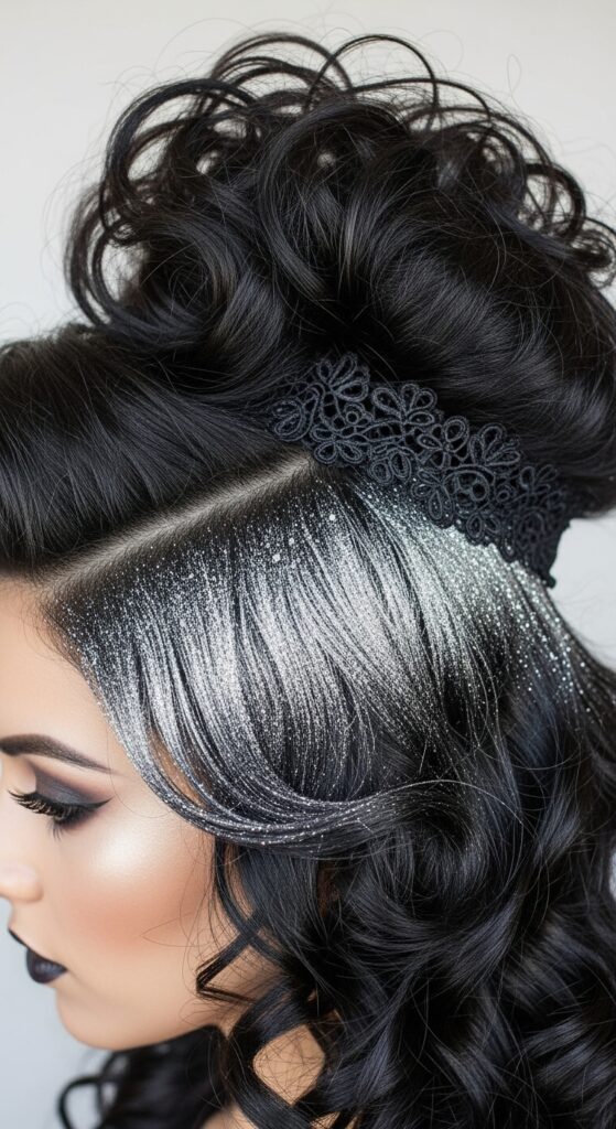 Velvety black curls take center stage in this hauntingly glamorous Halloween hairstyle, where volume meets artistry in a side-swept silhouette. A shimmering veil of silver glitter dusts the temple, catching light like moonlit frost and adding a celestial contrast to the dark waves. Nestled near the crown, a black lace accessory evokes Victorian mystique, tying the look together with theatrical elegance. Paired with bold makeup—deep plum lips, sculpted cheeks, and smoky eyes—this style channels gothic sophistication with a modern twist, perfect for upscale costume soirées or editorial-inspired Halloween shoots.