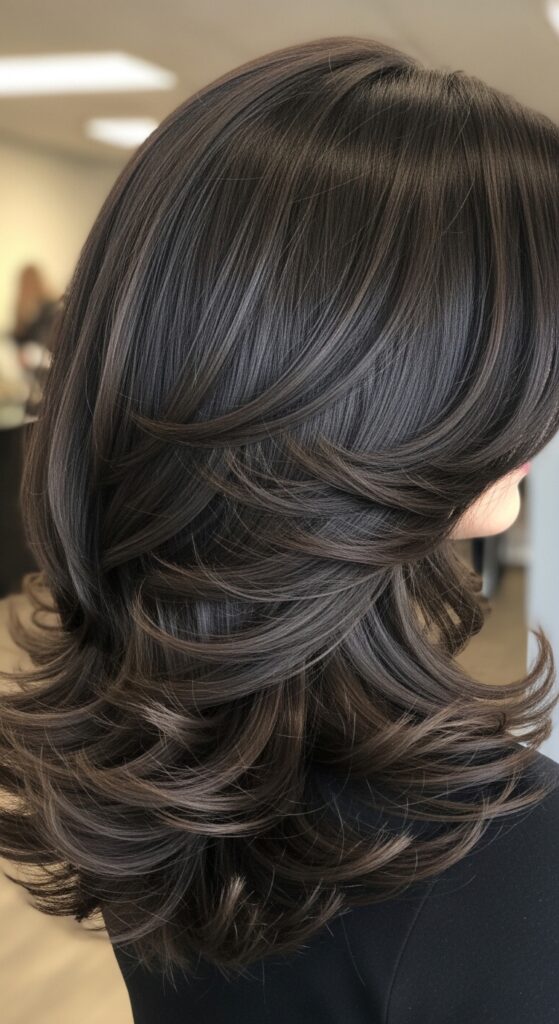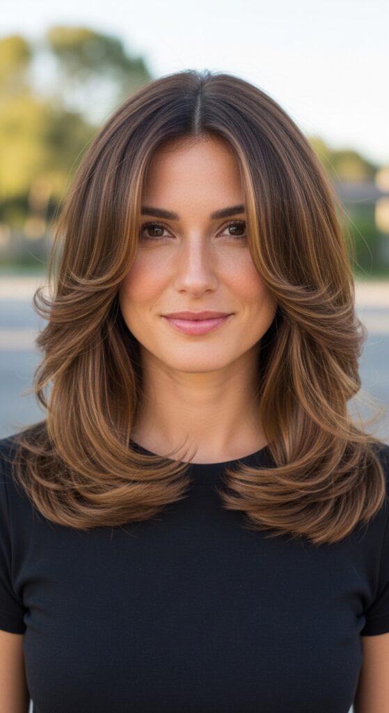 The layers are usually shorter around the crown and face, gradually blending into longer ends, which helps frame the face beautifully. This style is especially flattering because it adds lift to fine hair and removes bulk from thick hair, creating a balanced, voluminous appearance. The overall vibe is elegant, feminine, and effortlessly polished – perfect for both everyday wear and special occasions.
