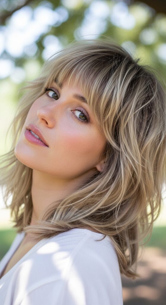 To get this hairstyle, ask your stylist for a shoulder-length shag with choppy, graduated layers and soft fringe (optional). The layers should be shorter at the crown for volume and gradually blend into longer ends to avoid a bulky shape. If you have fine hair, request lighter, airy layers to maintain thickness. For thick hair, ask for more pronounced layering to reduce weight and add definition.