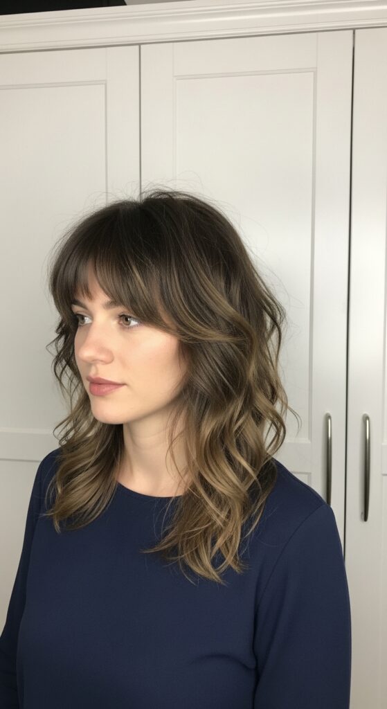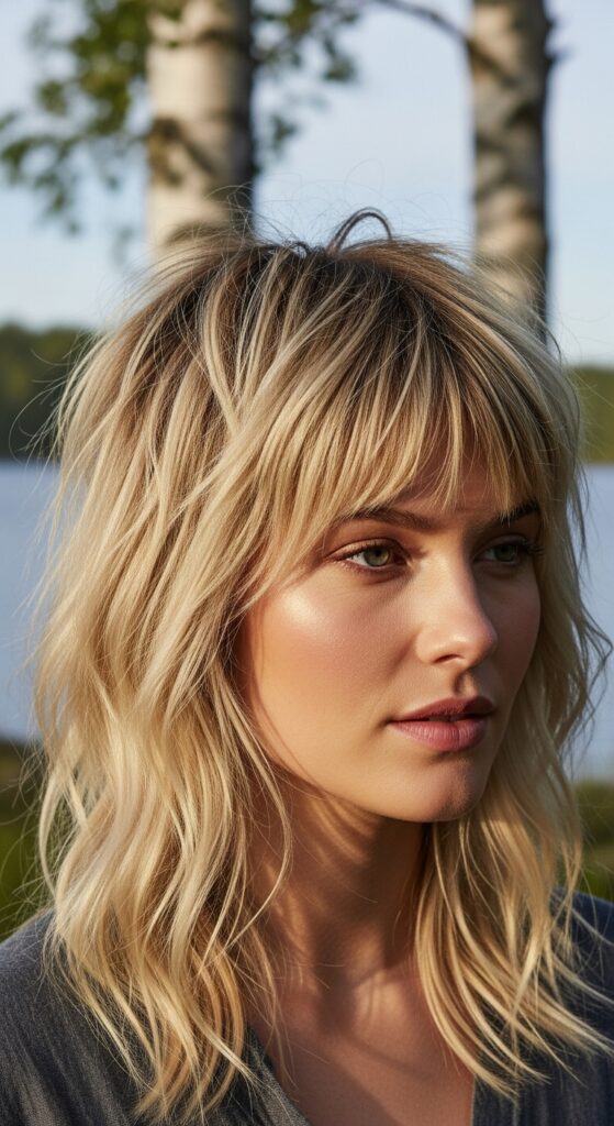 The layering enhances the wave pattern, preventing the hair from looking heavy or flat while adding definition and bounce. Often paired with curtain bangs or wispy fringe, the wavy shag beautifully frames the face and softens facial features. The overall vibe is effortlessly cool, slightly undone, and full of personality – ideal for women who love a modern, lived-in hairstyle with natural texture.