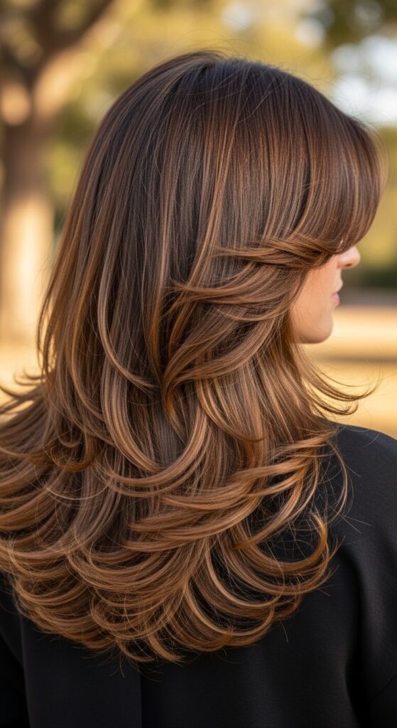 This look is especially flattering for women who want to balance elegance with a trendy, modern vibe. It’s versatile enough for straight hair, soft waves, or even a blowout finish. The warm brunette base with subtle highlights enhances depth, making the layers stand out even more.