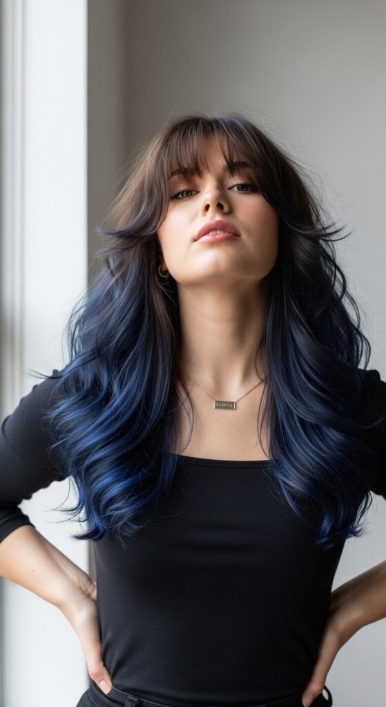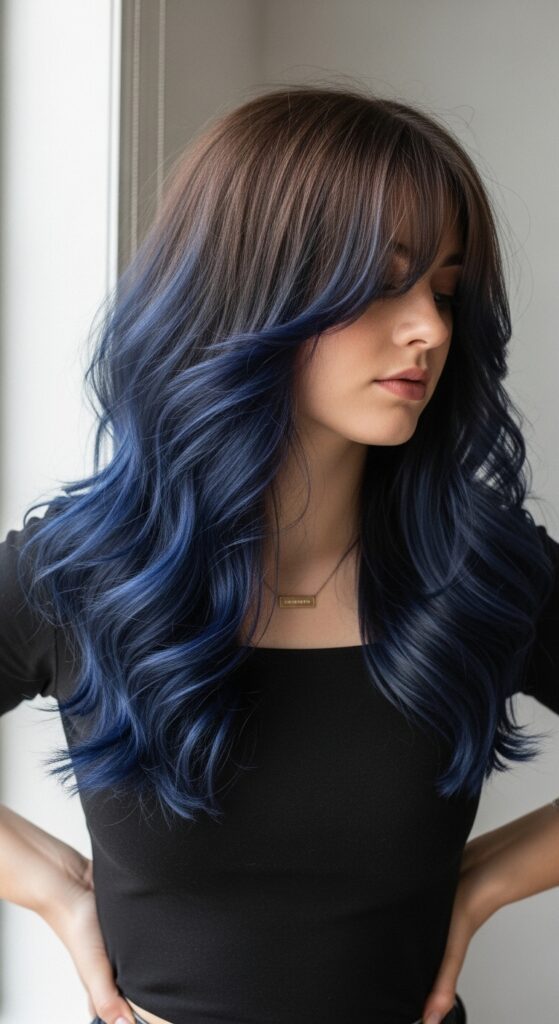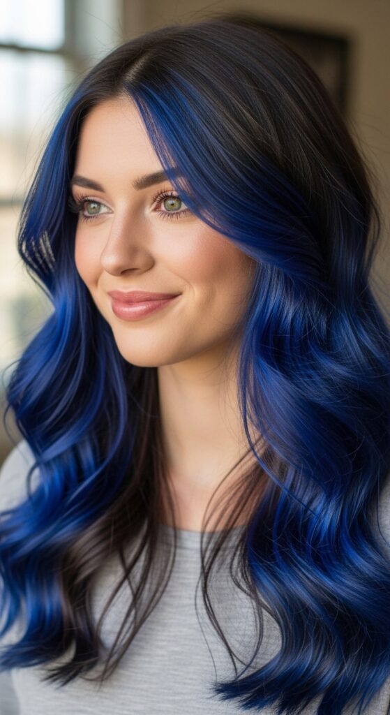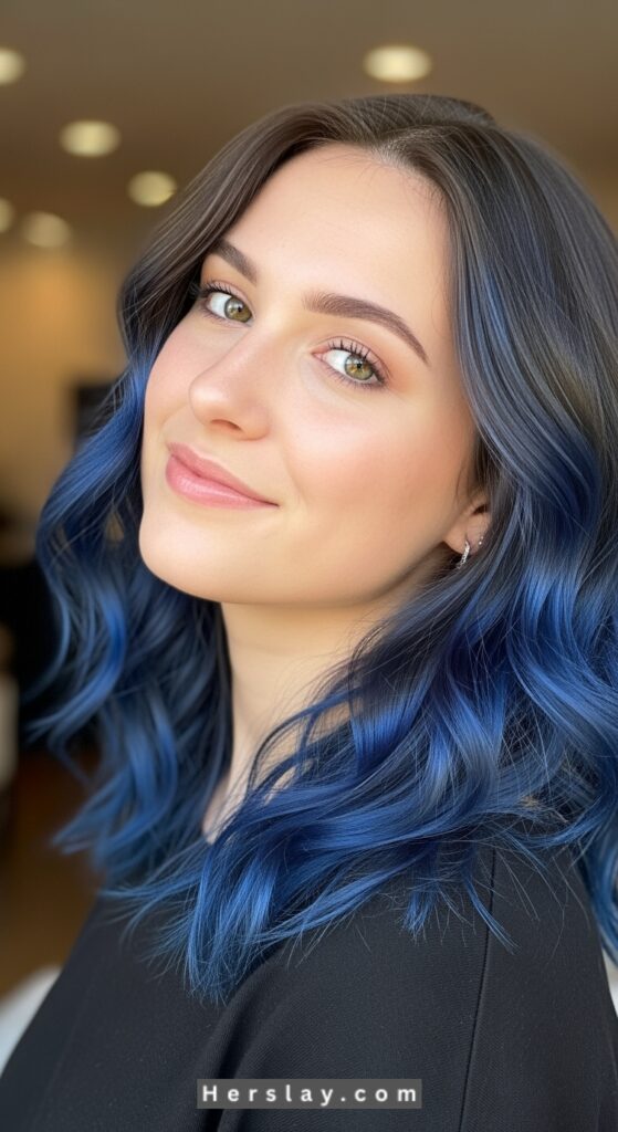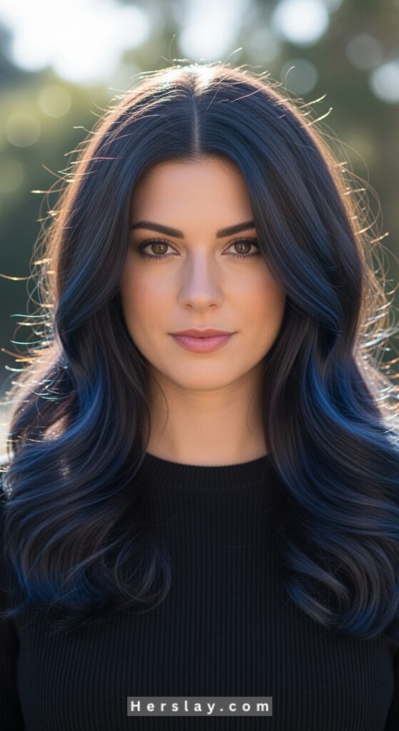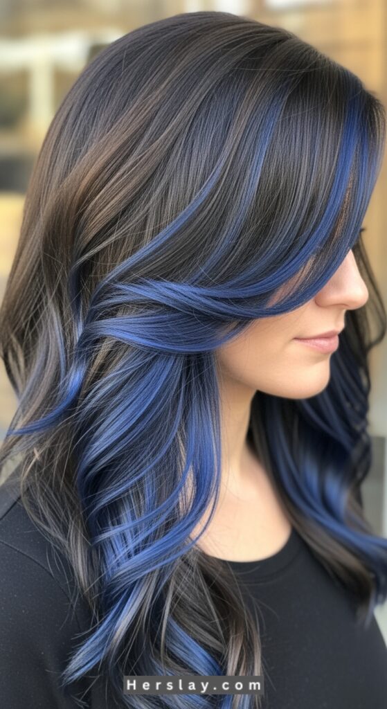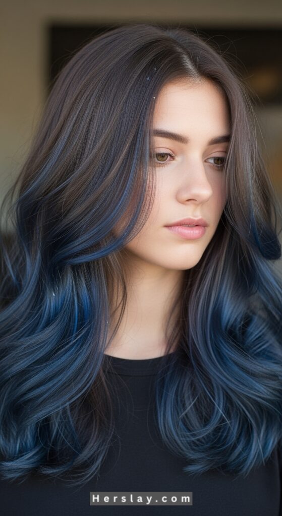One of the main appeals of navy and midnight blue highlights is their versatility. They work especially well on dark and medium brown hair, enhancing depth and shine rather than overpowering the base color. When placed strategically – such as through soft highlights, balayage, or peekaboo sections – the blue tones add dimension and movement while maintaining a polished, professional appearance.