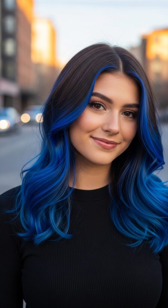 What makes electric and cobalt blue highlights so appealing is their ability to transform even simple hairstyles into something expressive and fashion-forward. Whether placed as chunky streaks, face-framing pieces, or subtle accents, these blue tones reflect light beautifully and add instant dimension. They are especially popular among those who enjoy creative color trends but still want to keep their natural brown base intact.