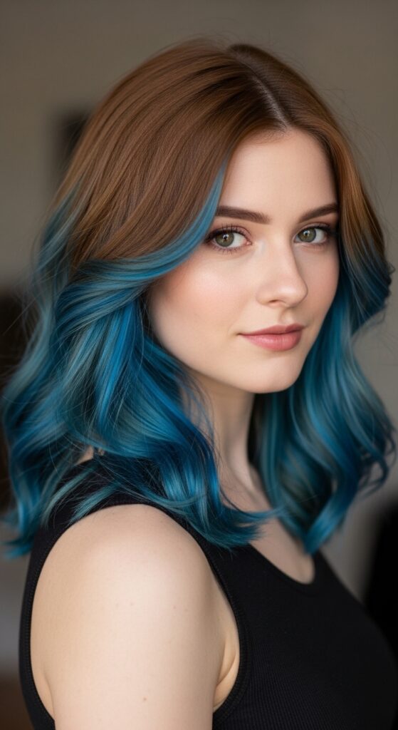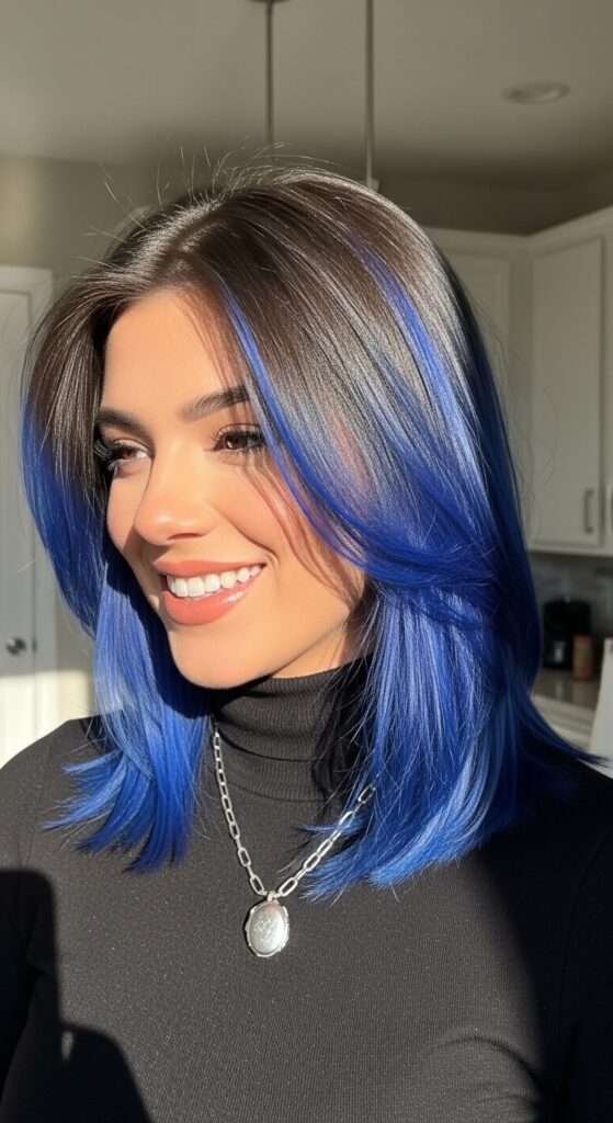 For those who love high-impact color, electric blue or cobalt highlights create a striking statement. These shades stand out sharply against brown hair and are often used as chunky highlights, balayage accents, or peekaboo sections. This variation is ideal for anyone who wants their hair color to be noticed instantly.