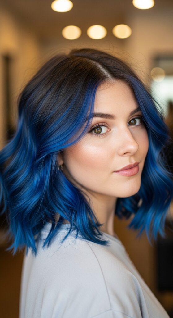 These highlights can be customized using different techniques depending on the desired effect. Peekaboo electric blue highlights offer a hidden burst of color that reveals itself with movement or styling, making them ideal for a playful yet controlled look. Balayage or ombré blue highlights create a more blended transition, softening the intensity while maintaining boldness. For maximum impact, foil highlights deliver crisp, saturated blue strands that stand out clearly.